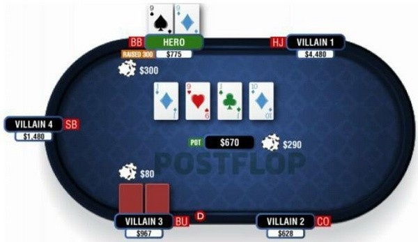 在这种场合,考虑你的对手在转牌圈再次下注的可能性有多大。我确定这可能足够证明尝试去check-raise(C/XC/XR)是正确的。但一个出乎意料的下注(C/XC/B)这里也是可以接受的。我的对手做了一个低于标准尺度的持续下注,我加注到300,他跟注。河牌是9♣,使我拿到了4条,但这远不是我想要的河牌,因为它很可能把对手吓跑。
