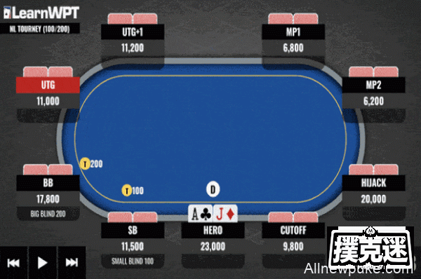 这手牌来自一个无限德州扑克锦标赛。盲注100/200,桌上玩家筹码量如图。翻前,MP2玩家率先加注到3BB,劫位玩家跟注,你在按钮位置用A♣ J♦再加注到11BB,大盲玩家、MP2玩家和劫位玩家都跟注。翻牌是9♣ 10♥ 4♠,前面三个玩家都check,轮到你行动,你会如何行动?