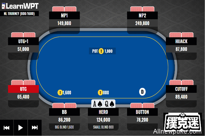 这手牌来自一个无限德州扑克锦标赛。当时盲注为800/1600。桌上玩家筹码量如图所示。翻前,MP1玩家率先加注到4800,然后他后面的MP2玩家3bet到11200。后面玩家陆续弃牌,轮到你在小盲位置行动。你的底牌是A♠ Q♠,你会如何行动?