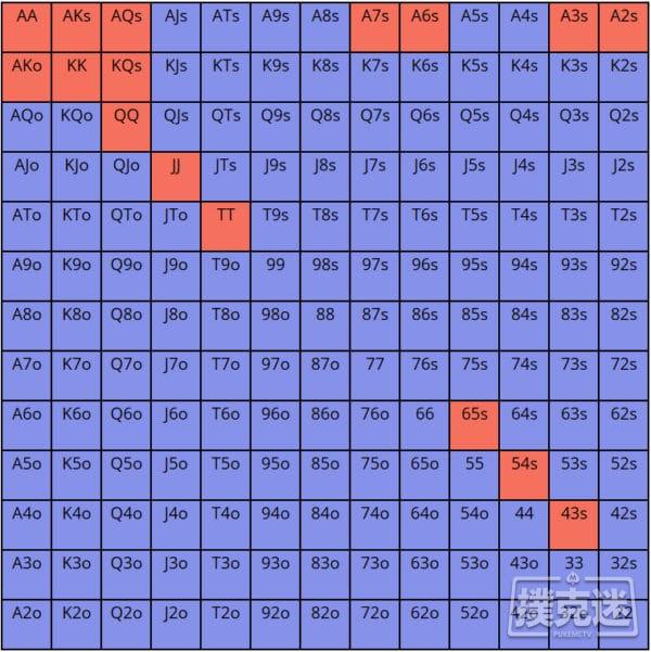对抗一个从不4bet的CO玩家,调整后的3bet范围是: