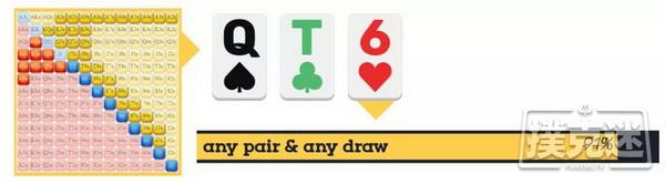 假设你认为对手翻前用约20%起手牌跟注你的翻前加注。这包括中小口袋对子、非同花大高张、同花连子、同花隔点连子(suited gapper)、同花Ax牌。如果翻牌是Q♠ T♣ 6♥,若你下注2/3底池,他会足够频繁地弃牌吗?