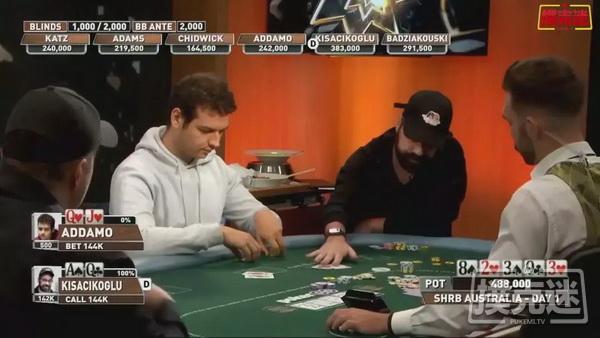 河牌发出了3♥,除了发出个公对这张3♥没有补全任何听牌,而面对199000的底池ADDAMO选择下注144000只留下500记分牌,基本相当于一个Allin。庄位玩家在扔出5个时间币思考后,最后选择用A高牌跟注成功抓鸡。
