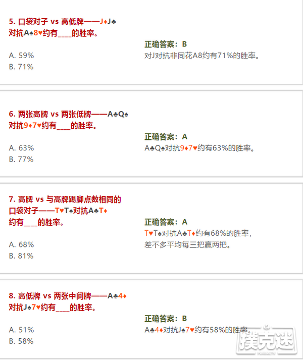 这次测试我们将给出8个翻前全压局面(几乎涉及了所有经常遇到的场景),看看你能够多准确地估计优势牌的获胜机会。测试中只有两个选项,请你认真思考每一个局面,然后做出你觉得的最佳选择。