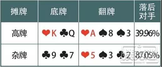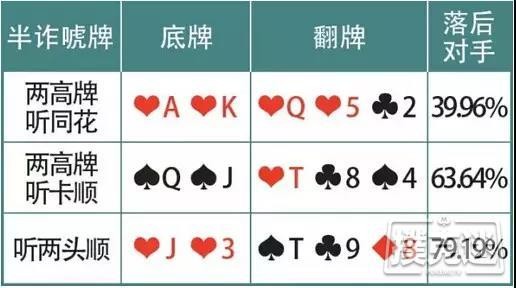 1. 半诈唬牌型(听牌):有同花、顺子等听牌的牌型,主动下注吓不走对手的时候,还可以靠着抽牌来逆转。这样存在着一定概率获胜的诈唬牌,被称为“半诈唬牌型”。