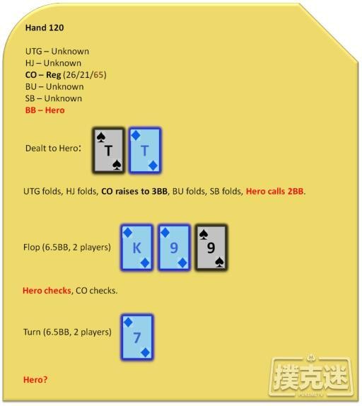 以下是我们转到本章下一部分之前的最后一手牌。试着问自己这手牌和上面的牌例121的主要差异是什么?这种差异如何影响我们的转牌圈决定?