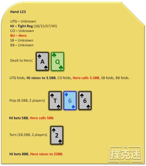 Hero的转牌圈诈唬加注通常产生于我们用非成手牌胜率翻牌圈飘浮跟注,现在我们的底池赔率+潜在底池赔率+摊牌价值不足以再次跟注的时候。正如在翻牌圈,Hero应该在跟注不怎么有利可图时考虑在转牌圈不利位置诈唬加注。当他在有利位置时,将整个加注范围延迟到河牌圈往往会更好,但如同扑克中的一切,这取决于具体情况。Hero也需要注意牌手类型,为那些可能弃牌的人保留转牌圈和河牌圈诈唬加注的玩法。被动型鱼玩家往往不会在转牌圈做太宽的下注,而且当他们这么做时,他们往往不会放弃那个范围中的太多牌。