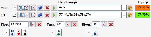 让我们带入范围来看一下玩家是否有所需要的底池权益(胜率):