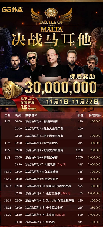 GGPoker继WSOP、WPT成功的举办线上赛事之后,这次将与欧洲殿堂级扑克盛会携手主办2020年” 决战马耳他(Battle of Malta)”线上系列赛。该系列赛将从11月1日到11月22日展开。