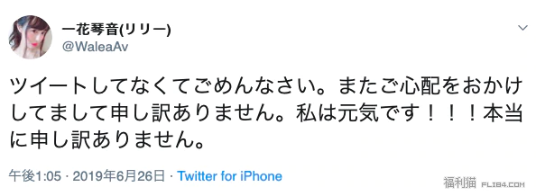 尽管这不是她第一次想不开,但看到她的发文还是让人相当不安,不过还好,业界并没有再添一椿不幸,一花琴音在昨天已经和大家报平安,也透露7月6日要去拍片~