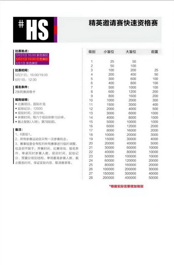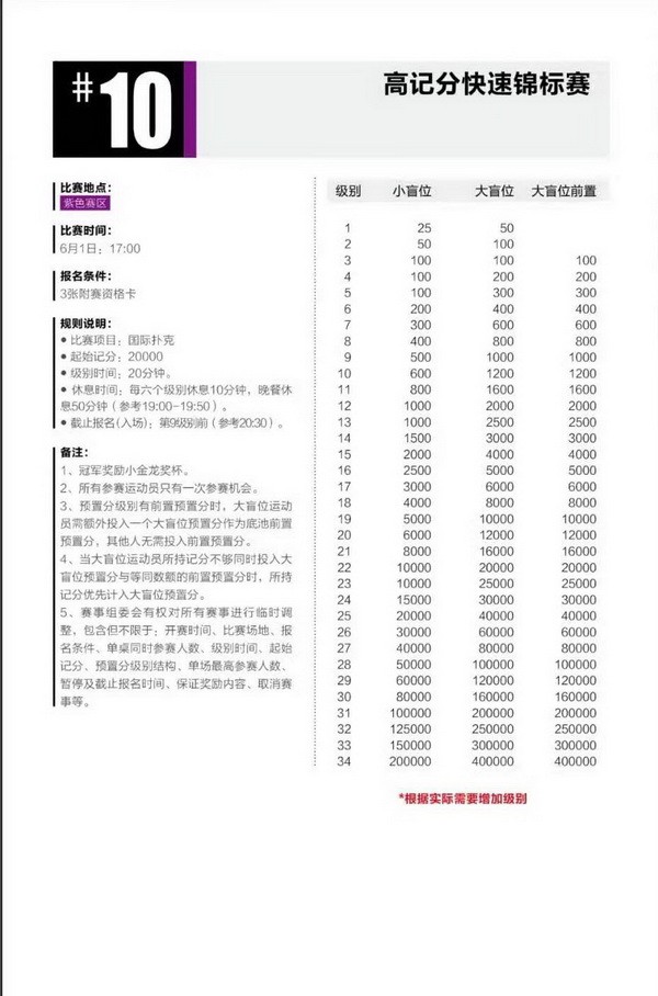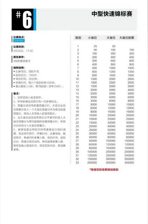 本次赛事所有国际扑克项目比赛除资格赛之外全部采用大盲前置模式。
