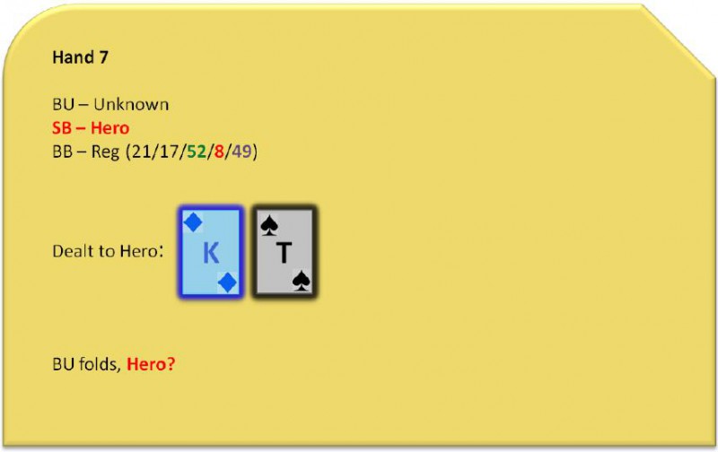 同样,我将推荐一个信息极其有限场合的缺省范围。但如同在上一节,在小盲位置率先加注是一个非常动态的局面,我们率先加注的要求主要取决于对手。Hero的HUD数据和他的判断能力在这里是他的两个最好朋友。