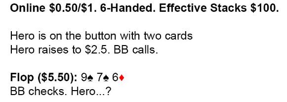 9. 这是一手合理的随后check牌,因为它不会从下注那儿得到多少保护,而且踢脚牌比较差,难以从弱牌那儿得到价值。虽说如此,在这种场合用几乎100%的频率做小额下注也是一种软件认可的策略。因此,只要你是用宽范围做小额下注,下注也是合理的。