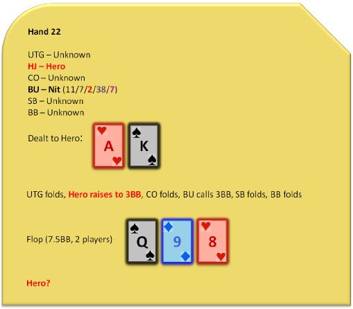 并非所有的翻牌面都不宜对nit玩家持续下注。在干燥的A-x-x及K-x-x翻牌面,因为对手范围中的较高比率的口袋对子,Hero应该仍然能指望得到较高的弃牌赢率。真正的技巧是结合各种持续下注考虑因素去评估整个局面。我们接下来将开始学习如何在牌桌上评估下一个持续下注考虑因素。
