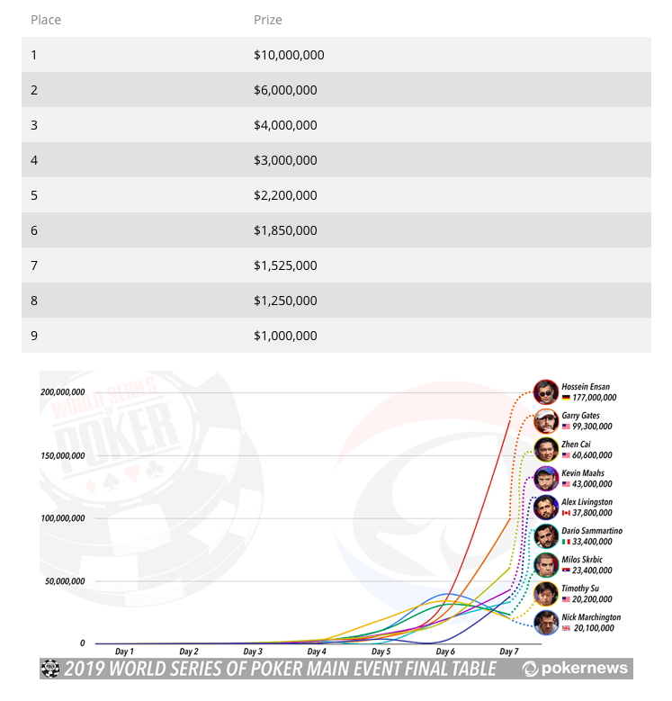 经过长达一周且每天12+小时的鏖战后,2019 WSOP主赛终于走到终极9人决胜桌环节,冠军选手的奖励高达1000万美元。