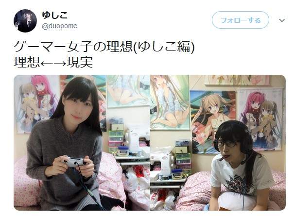 这个〝游戏女孩的理想与现实〞是由推主“ゆしこ@duopome”在这两天分享到网络上的内容,基本上有在跟台的朋友对于女实况主应该也都有初步的了解,我知道有些人比较会〝做自己〞,但大多数的人还是会打扮一下,也许性感一点是特色,但多少会上个妆或弄好看一点,而这位推友所表现出来的状况,认为比较偏向私底下的样子,一般女玩家平常在打游戏时,你以为的幻想中情况跟实际上私底下的情况做个比较这样。