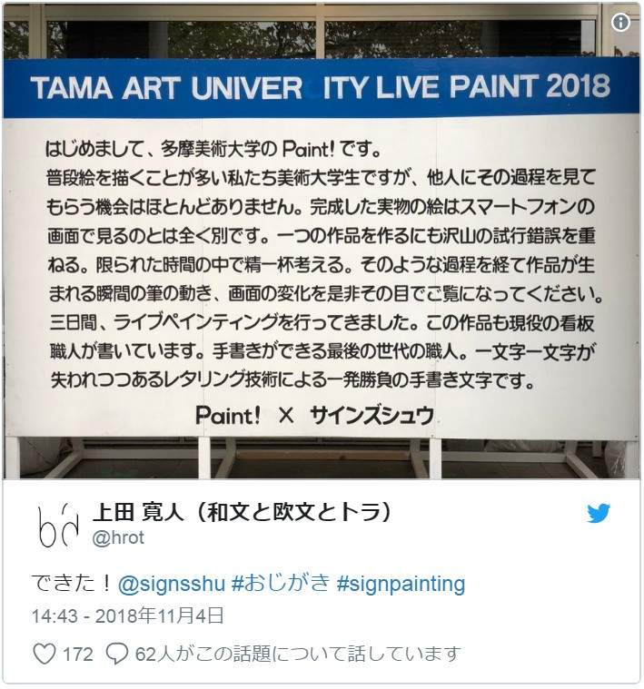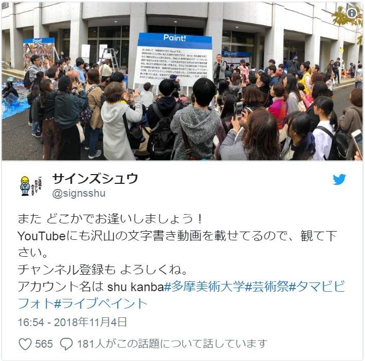 在大阪经营看板屋的サインズシュウ(@signsshu)说连儿子大学都不曾去过的自己,没想到有幸受到日本美术人才辈出的多摩美术大学邀请现场表演,对他来说也是梦幻一般的体验。