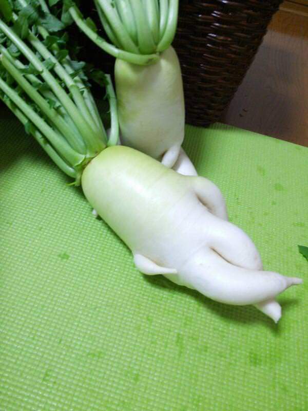 当时推特上的“根菜农家うめまま”并不是只有一个大根明星,他们栽种出来的白萝卜,也有些模样是非常奇特可以拿来玩耍...不!应该是说拿来当成拍趣味照的素材,因此除了逃走的那位大根明星以外,也有许许多多不同模样可以拿来说故事的大根。