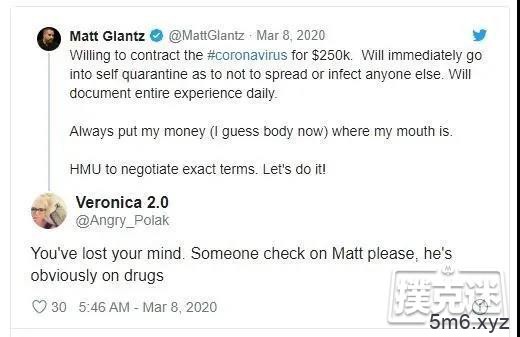 居然把感染病毒这么严重的事当成赌约?而且他还挺有理...他说,反正不知道什么时候肯定会感染,为什么不趁此机会赚点钱?万一美国医疗体系给力的话,说不定很快就能治愈呢,白赚啊!