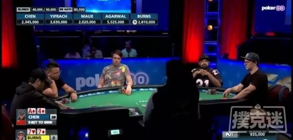 这里他选择了大尺度的3bet,加注到600K,占自己总记分牌量的25%左右,而对手此时需要跟注425K,也是5个大盲注。对Burns来说是一个令他非常难受的action,他在犹豫很久之后选择了跟注。
