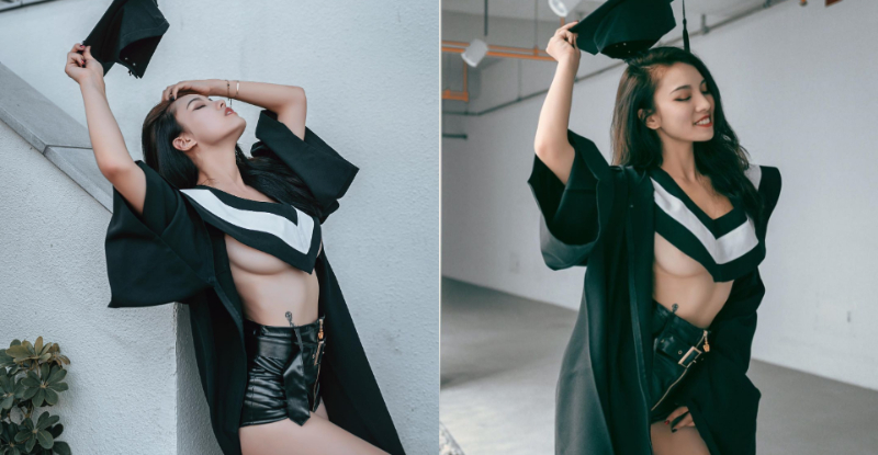 Effi是高雄的平面模特兒,其實她去年就就已經大學畢業,這次為了作品再度換上學士袍,只是這穿法直接刷新大家三觀,只著領子的這種穿法會直接露出奶球下緣,難道是順便宣告自己已經長大的意思?