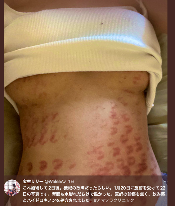 虽然很久没有发片,不过宝生リリー(宝生莉莉)总是有办法上新闻版面—只可惜都不是好消息,昨天,她在Twitter上Po了自己受伤的照片,说是在医美诊所进行除毛手术时因为机器故障导致严重灼伤,然后院方完全不认帐,所以宝生リリー(宝生莉莉)找来律师并且公布受伤的模样,要为自己讨公道: