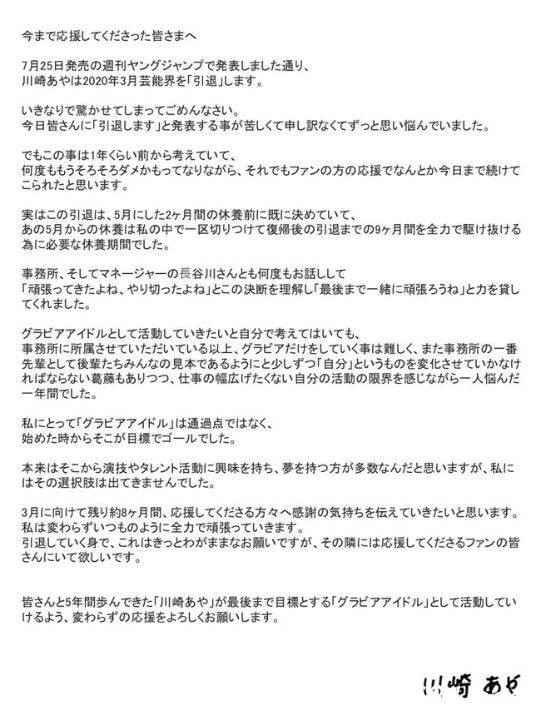 事实上,川崎绫从去年4月时,就宣布了自己要休息充电的消息,结果没隔多久,她就传出了引退的消息。据悉,川崎绫是在5月,也就是休养期间做出这个决定,虽然消息一出,大批粉丝们都十分不捨,不过也尊重她的决定,并忍不住猜测她接下来的发展,在网上造成一阵譁然。